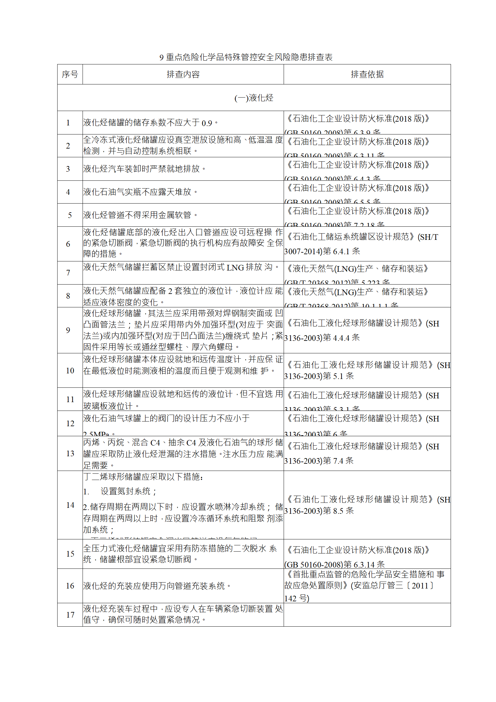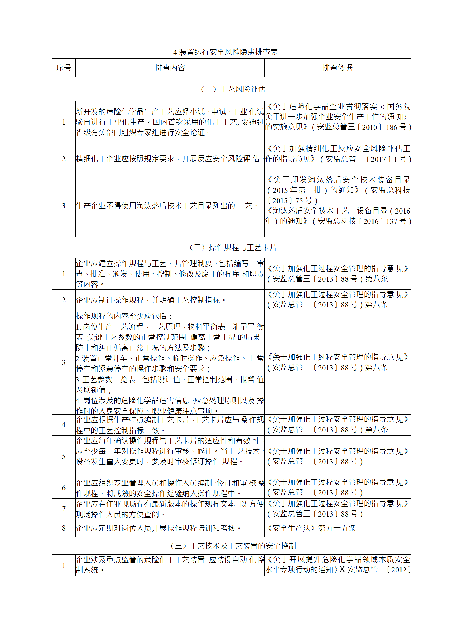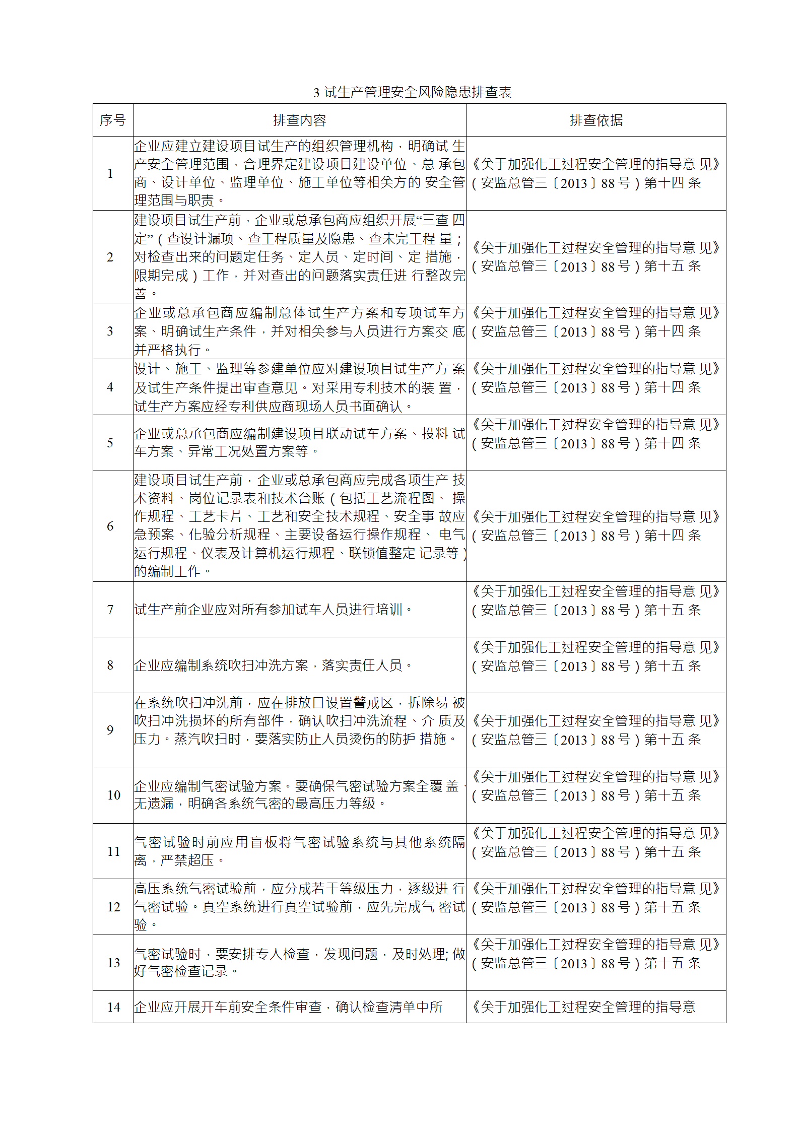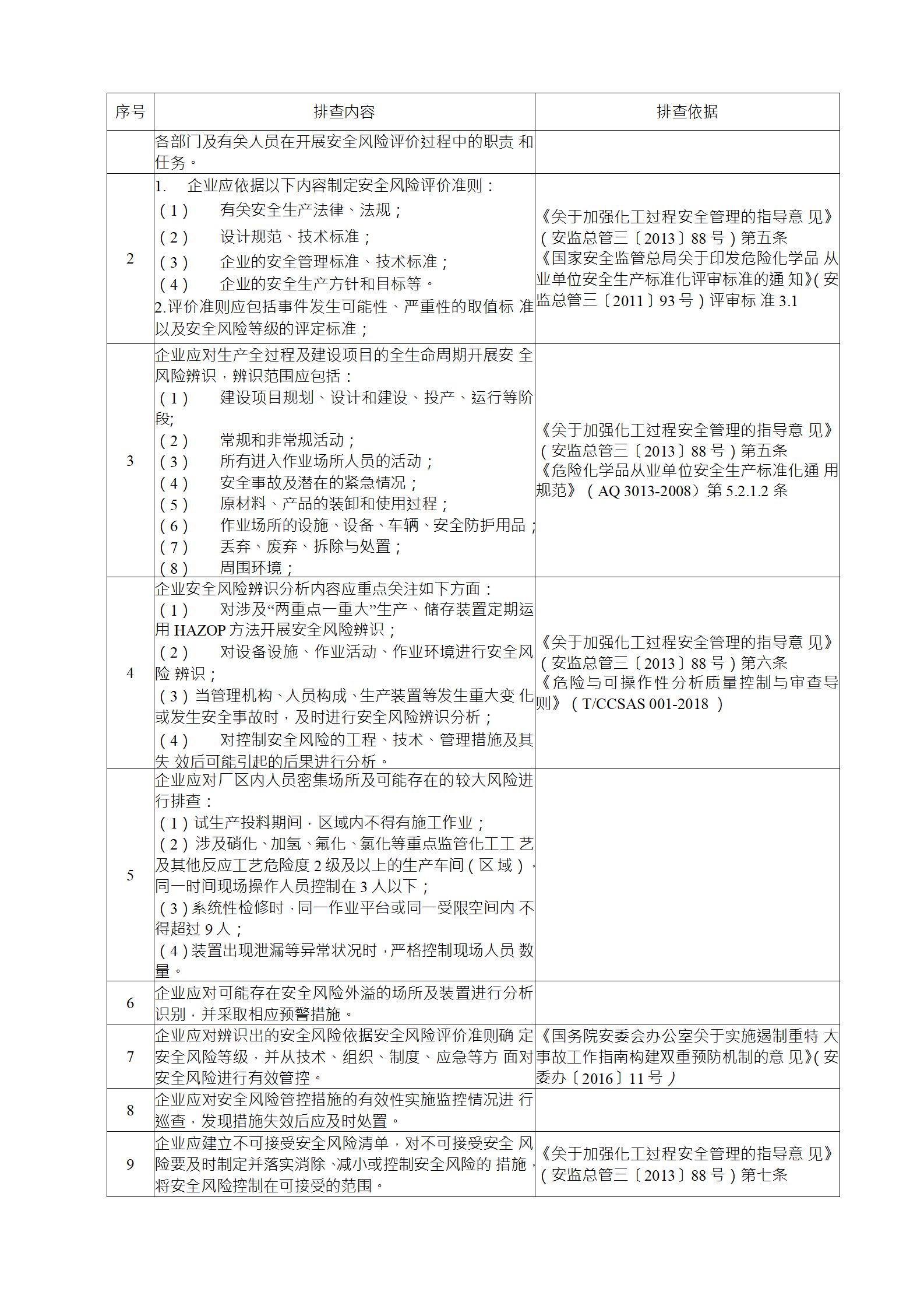 企業(yè)應(yīng)結(jié)合自身安全風(fēng)險(xiǎn)及管控水平,按照化工過(guò)程安全 管理的要求,參照各專業(yè)安全風(fēng)險(xiǎn)隱患排查表(見(jiàn)附件),編制 符合自身實(shí)際的安全風(fēng)險(xiǎn)隱患排查表,開(kāi)展安全風(fēng)險(xiǎn)隱患排查 工作。