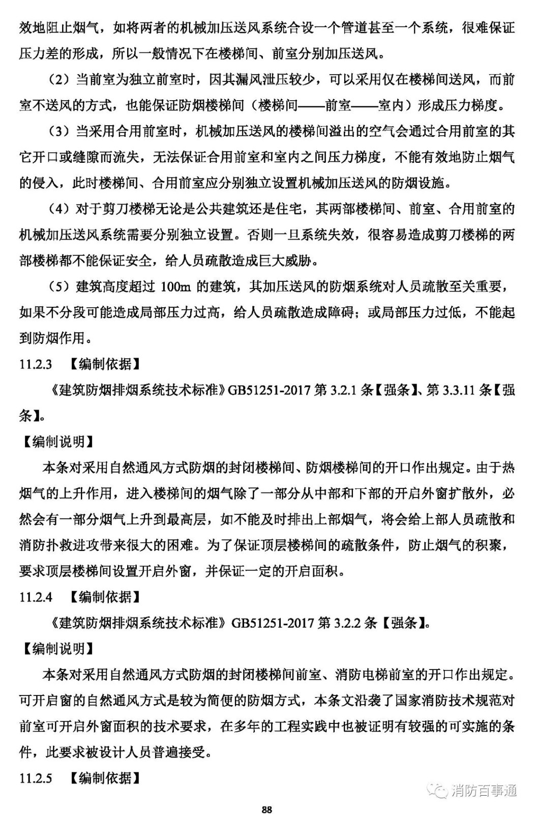 11.2.4 采用自然通風(fēng)方式防煙的防煙樓梯間前室、消防電梯前室應(yīng)具有面積不小于2.0㎡ 的可開(kāi)啟外窗或開(kāi)口,合用前室應(yīng)具有面積不小于3.0㎡ 的可開(kāi)啟外窗或開(kāi)口。