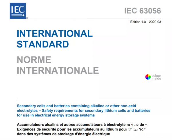 IEC 63056:2020規(guī)定了最高直流電壓為1500 V的電力儲(chǔ)能用二次鋰電池和電池組的安全要求和測(cè)試。IEC 63056:2020僅給出了電力儲(chǔ)能用二次鋰電池和電池組的附加或特殊要求,其基本安全要求在IEC 62619中規(guī)定。