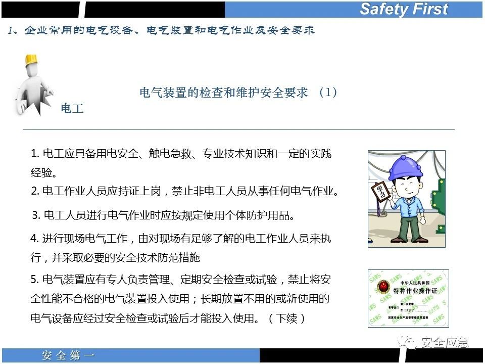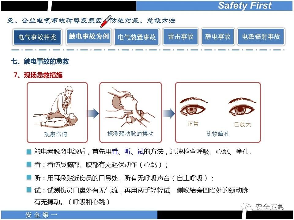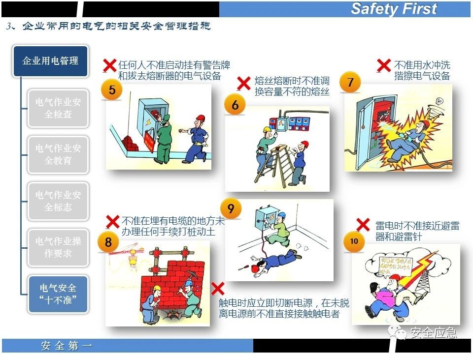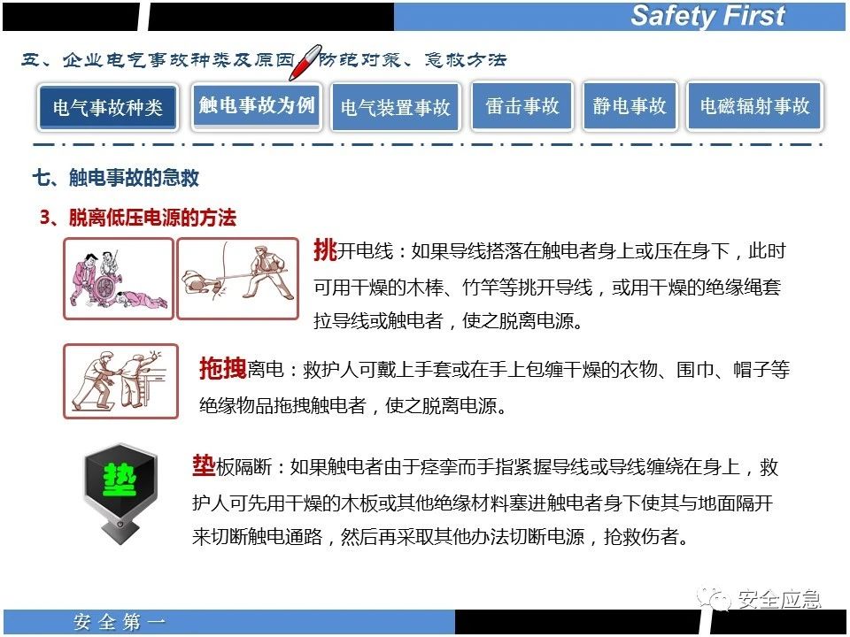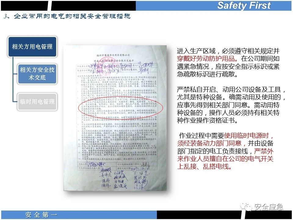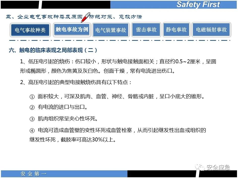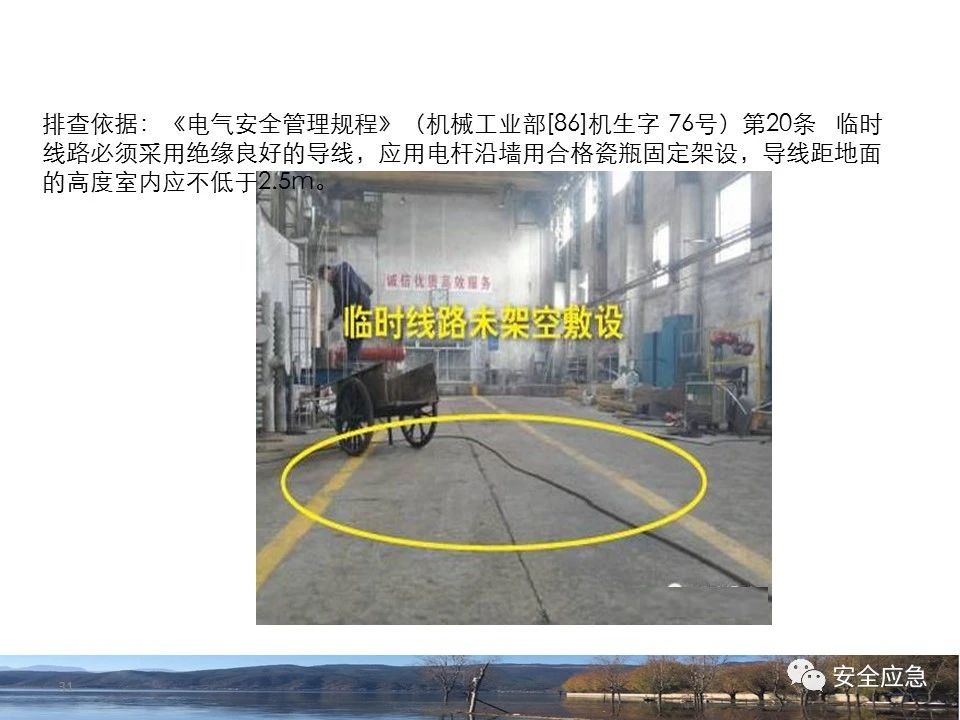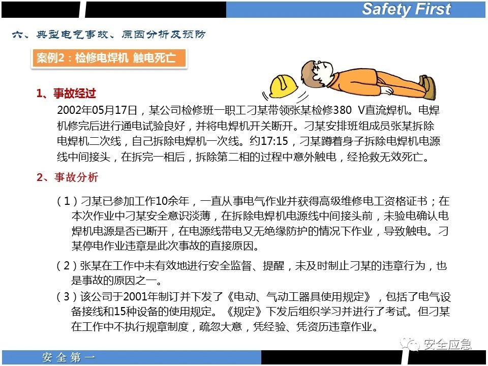 案例73 事故案例73:某35變電站準(zhǔn)備10kV避雷器試驗(yàn)。作業(yè)人員會(huì)同運(yùn)行人員準(zhǔn)備查看設(shè)備實(shí)際情況,拆卸10kV開(kāi)關(guān)柜背板螺栓,打開(kāi)了柜門(mén)上的電磁鎖,并打開(kāi)了后柜門(mén)后,作業(yè)人員探頭進(jìn)入開(kāi)關(guān)柜內(nèi)時(shí),對(duì)開(kāi)關(guān)柜放電。 其它案例見(jiàn)17、18、19、20、21、22、23、50、52。 (27)多組人員組織混亂 案例74 事故案例74:某單位開(kāi)展500kV線路停電檢修和地線融冰試驗(yàn)。1名工作人員不聽(tīng)他人勸阻,登塔拆除引流線。隨后開(kāi)展地線融冰試驗(yàn),該工作人員觸電死亡。 其它案例見(jiàn)45、46、47、48。 (28)交底不認(rèn)真 案例75 事故案例75:某工作負(fù)責(zé)人帶領(lǐng)兩名工作人員準(zhǔn)備在10kV線路裝設(shè)接地線。工作前,工作負(fù)責(zé)人沒(méi)有進(jìn)行班前(后)會(huì),沒(méi)有分配工作任務(wù),也沒(méi)有交代安全注意事項(xiàng),另外兩人也沒(méi)有主動(dòng)詢(xún)問(wèn),相互提醒,導(dǎo)致工作負(fù)責(zé)人無(wú)監(jiān)護(hù)誤登運(yùn)行線路,造成觸電。 其它案例見(jiàn)32。 (29)監(jiān)護(hù)不到位 l 單人工作無(wú)監(jiān)護(hù) 事故案例:36。 l 監(jiān)護(hù)人參與工作 事故案例:11。 l 監(jiān)護(hù)不認(rèn)真,或默許違章行為 事故案例:67。 (30)人員、工作安排不恰當(dāng) 案例76 事故案例76:某供電所安排不具備單獨(dú)工作資格和能力的新入廠員工上桿進(jìn)行配變?cè)O(shè)備搶修工作,由于安全距離不夠,員工經(jīng)驗(yàn)不足,監(jiān)護(hù)不到位,導(dǎo)致觸電。 案例77 事故案例77:某高壓試驗(yàn)班開(kāi)展定檢預(yù)試作業(yè)。工作負(fù)責(zé)人與工作人員在抄錄放電計(jì)數(shù)器銘牌,另一名剛參加工作不久的工作人員拿著自制試驗(yàn)線插入移動(dòng)電源盤(pán)插座內(nèi),然后,用左、右手分別拿住兩個(gè)鱷魚(yú)夾準(zhǔn)備對(duì)放電器搭接做試驗(yàn),左、右手習(xí)慣性的分別握住了兩個(gè)鱷魚(yú)夾的導(dǎo)體部分,此時(shí)電流通過(guò)人體,漏電保護(hù)器沒(méi)有動(dòng)作,觸電死亡。 (31)單人作業(yè) l 野外單人巡線、勘察 案例78 事故案例78:某單位開(kāi)展線路巡視時(shí),單人作業(yè),在被告知“巡視完N58塔后切勿過(guò)江,要沿原路返回”的情況下,仍然獨(dú)自一人違規(guī)游泳過(guò)江,溺水身亡。 案例79 事故案例79:某單位野外勘察時(shí),某工作人員在未告知工作負(fù)責(zé)人的情況下,獨(dú)自一人返回車(chē)輛所在地,途中墜落懸崖暈倒,受輕傷并失蹤12小時(shí)。 附件:最全面的電氣安全培訓(xùn),實(shí)用!