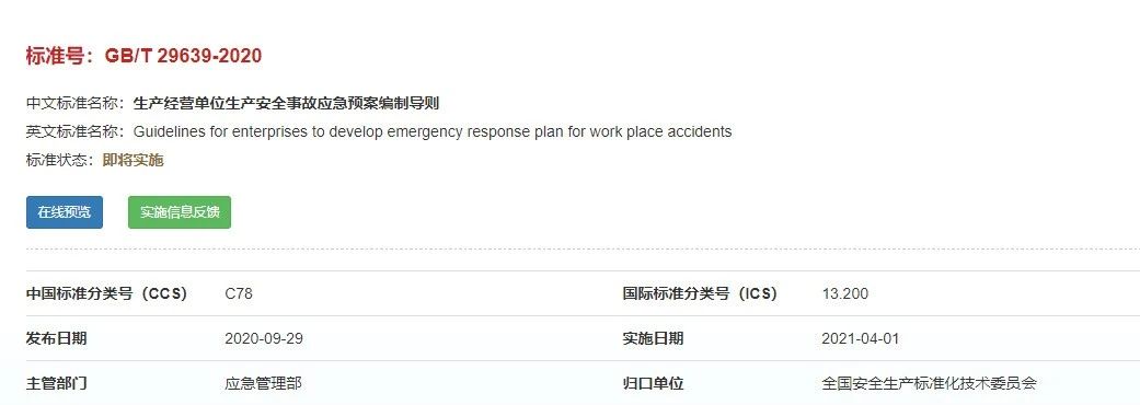 重磅!GBT29639-2020《生產經營單位生產安全事故應急預案編制導則》發(fā)布,21年4月實施!