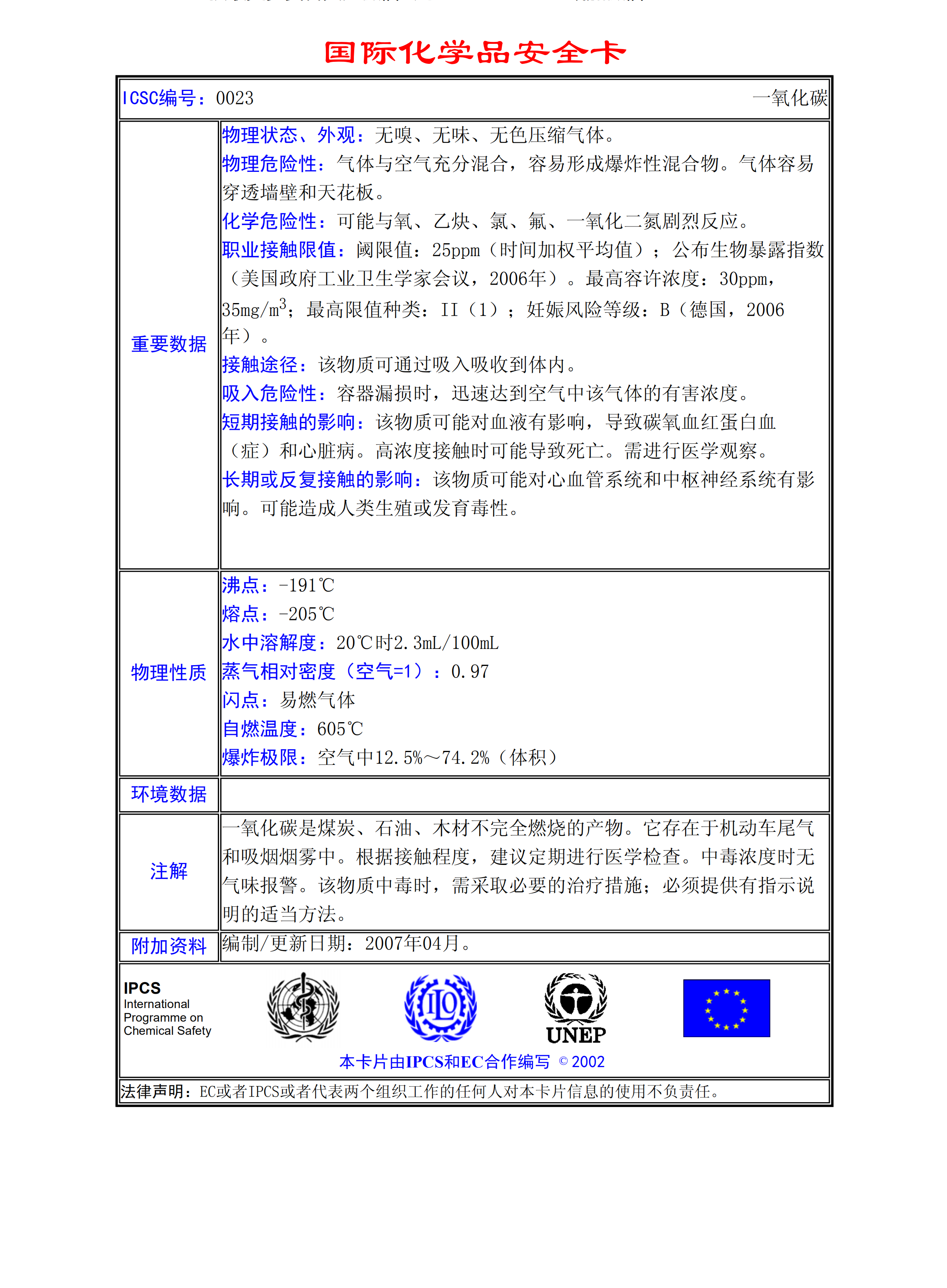 一氧化碳MSDS