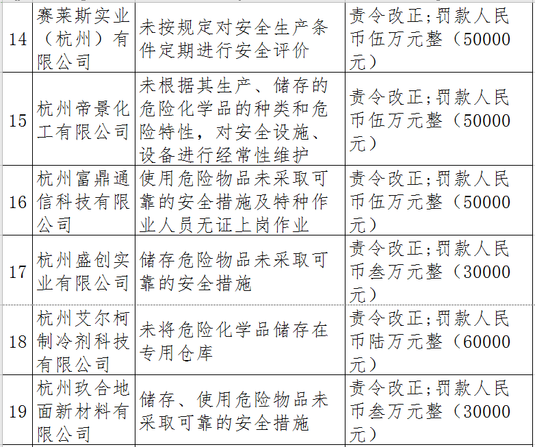據(jù)了解,今年上半年,杭州市應(yīng)急管理局一手抓駐企復工復產(chǎn)、一手抓安全生產(chǎn),已完成年度執(zhí)法計劃、專項檢查、聯(lián)合執(zhí)法、信訪舉報核查等,并對檢查中發(fā)現(xiàn)的安全生產(chǎn)違法違規(guī)企業(yè)(個人)進行了處罰。現(xiàn)對52家被行政處罰的企業(yè)(個人)進行曝光,希望各企業(yè)引以為戒!