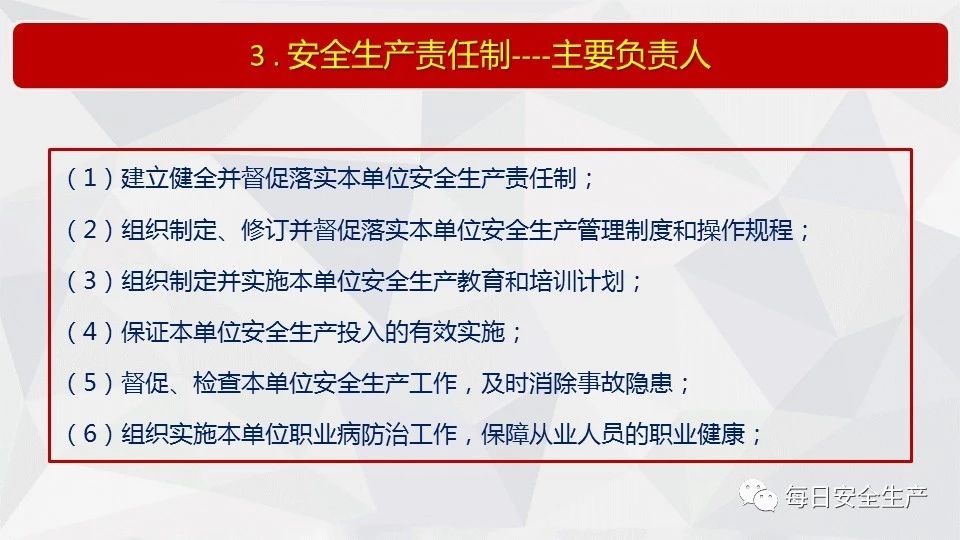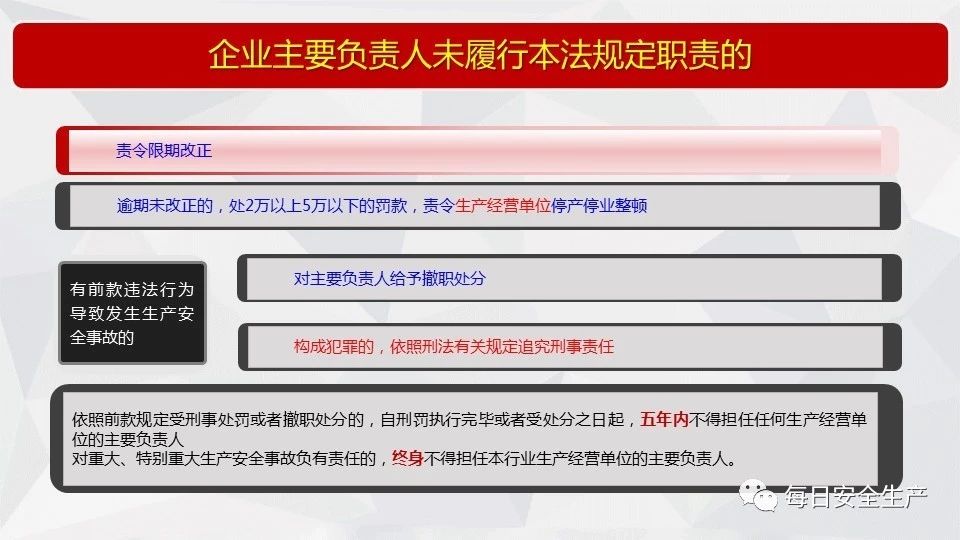 組織機構(gòu)和職責(zé) | 主要負(fù)責(zé)人未履行安全生產(chǎn)管理職責(zé)的 | 責(zé)令限期改正 | 對主要負(fù)責(zé)人處二萬元以上五萬元以下的罰款,責(zé)令生產(chǎn)經(jīng)營單位停產(chǎn)停業(yè)整頓。 |
