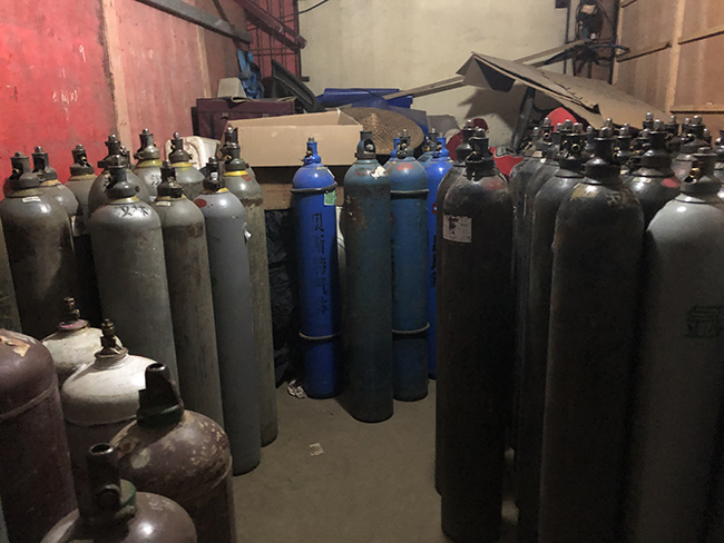 浙江杭州市案例:2021年3月8日上午,浙江省杭州市蕭山區(qū)應(yīng)急管理局執(zhí)法人員對某公司進(jìn)行執(zhí)法檢查。期間,執(zhí)法人員發(fā)現(xiàn)廠區(qū)內(nèi)一簡易鋼棚搭設(shè)的倉庫,玻璃窗均被物體人為遮擋,檢查發(fā)現(xiàn)倉庫內(nèi)堆放了大量?;罚M瓶二氧化碳、氧氣、乙炔、混合氣體、氮?dú)獾?span style="margin-bottom: 37px;line-height: 37px;font-size: 21px">176個氣瓶。同時,該倉庫緊鄰公司員工宿舍樓搭設(shè),宿舍樓里還住著數(shù)十個工人,一旦發(fā)生爆炸,后果不堪設(shè)想。