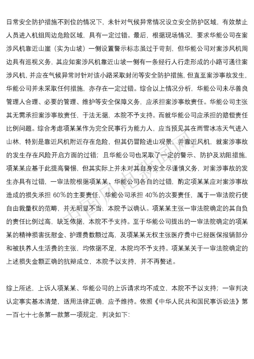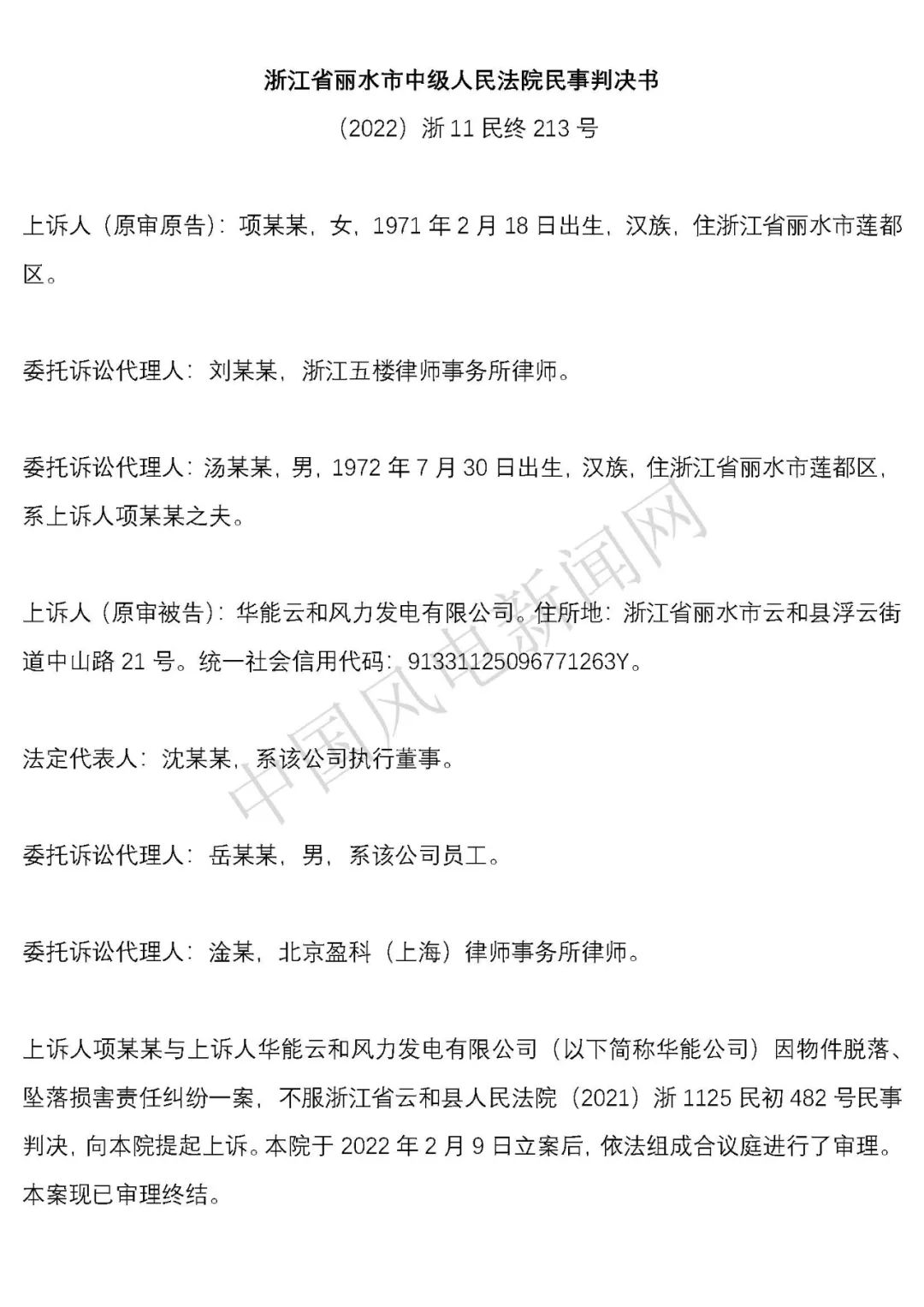 近日,浙江省麗水市中級人民法院發(fā)布華能云和風力發(fā)電有限公司、項建英物件脫落、墜落損害責任糾紛二審民事判決書,判決書顯示: