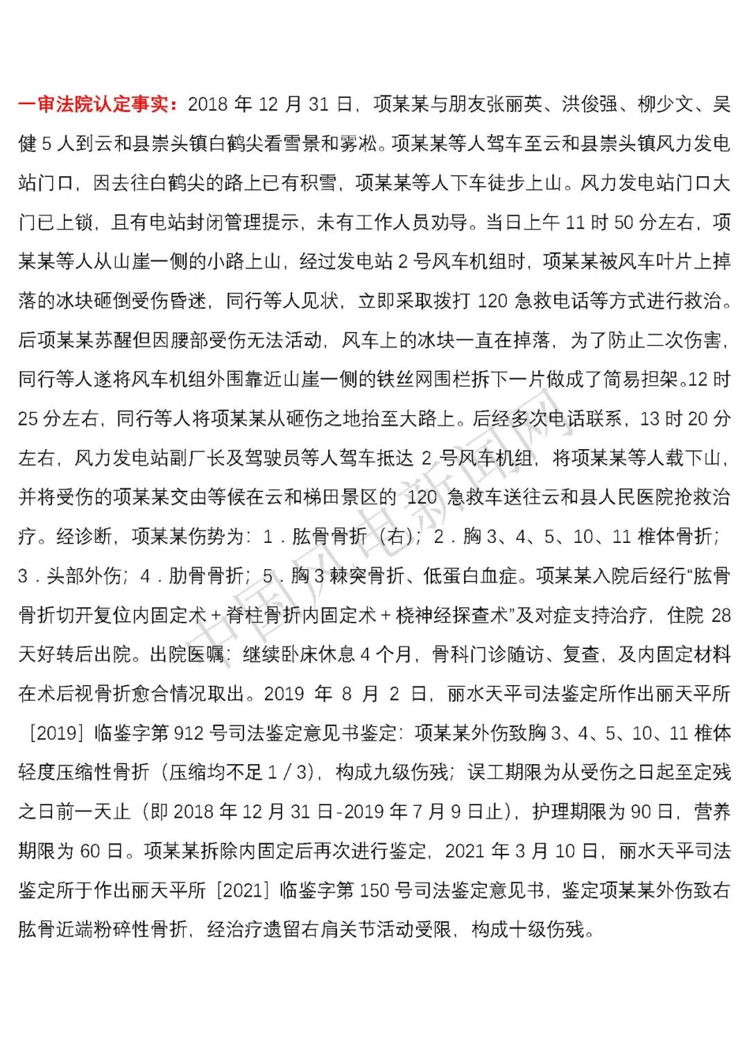 法院認定事實:2018年12月31日,項建英與朋友張麗英、洪俊強、柳少文、吳健5人到云和縣崇頭鎮(zhèn)白鶴尖看雪景和霧凇。項建英等人駕車至云和縣崇頭鎮(zhèn)風力發(fā)電站門口,因去往白鶴尖的路上已有積雪,項建英等人下車徒步上山。風力發(fā)電站門口大門已上鎖,且有電站封閉管理提示,未有工作人員勸導。當日上午11時50分左右,項建英等人從山崖一側(cè)的小路上山,經(jīng)過發(fā)電站2號風車機組時,項建英被風車葉片上掉落的冰塊砸倒受傷昏迷,同行等人見狀,立即采取撥打120急救電話等方式進行救治。后項建英蘇醒但因腰部受傷無法活動,風車上的冰塊一直在掉落,為了防止二次傷害,同行等人遂將風車機組外圍靠近山崖一側(cè)的鐵絲網(wǎng)圍欄拆下一片做成了簡易擔架。12時25分左右,同行等人將項建英從砸傷之地抬至大路上。后經(jīng)多次電話聯(lián)系,13時20分左右,風力發(fā)電站副廠長及駕駛員等人駕車抵達2號風車機組,將項建英等人載下山,并將受傷的項建英交由等候在云和梯田景區(qū)的120急救車送往云和縣人民醫(yī)院搶救治療。經(jīng)診斷,項建英傷勢為:1.肱骨骨折(右);2.胸3、4、5、10、11椎體骨折;3.頭部外傷;4.肋骨骨折;5.胸3棘突骨折、低蛋白血癥。項建英入院后經(jīng)行“肱骨骨折切開復位內(nèi)固定術(shù)+脊柱骨折內(nèi)固定術(shù)+橈神經(jīng)探查術(shù)”及對癥支持治療,住院28天好轉(zhuǎn)后出院。出院醫(yī)囑:繼續(xù)臥床休息4個月,骨科門診隨訪、復查,及內(nèi)固定材料在術(shù)后視骨折愈合情況取出。2019年8月2日,麗水天平司法鑒定所作出麗天平所[2019]臨鑒字第912號司法鑒定意見書鑒定:項建英外傷致胸3、4、5、10、11椎體輕度壓縮性骨折(壓縮均不足1/3),構(gòu)成九級傷殘;誤工期限為從受傷之日起至定殘之日前一天止(即2018年12月31日-2019年7月9日止),護理期限為90日,營養(yǎng)期限為60日。項建英拆除內(nèi)固定后再次進行鑒定,2021年3月10日,麗水天平司法鑒定所于作出麗天平所[2021]臨鑒字第150號司法鑒定意見書,鑒定項建英外傷致右肱骨近端粉碎性骨折,經(jīng)治療遺留右肩關節(jié)活動受限,構(gòu)成十級傷殘。