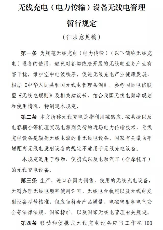 《無(wú)線充電(電力傳輸)設(shè)備無(wú)線電管理暫行規(guī)定》公開征求意見